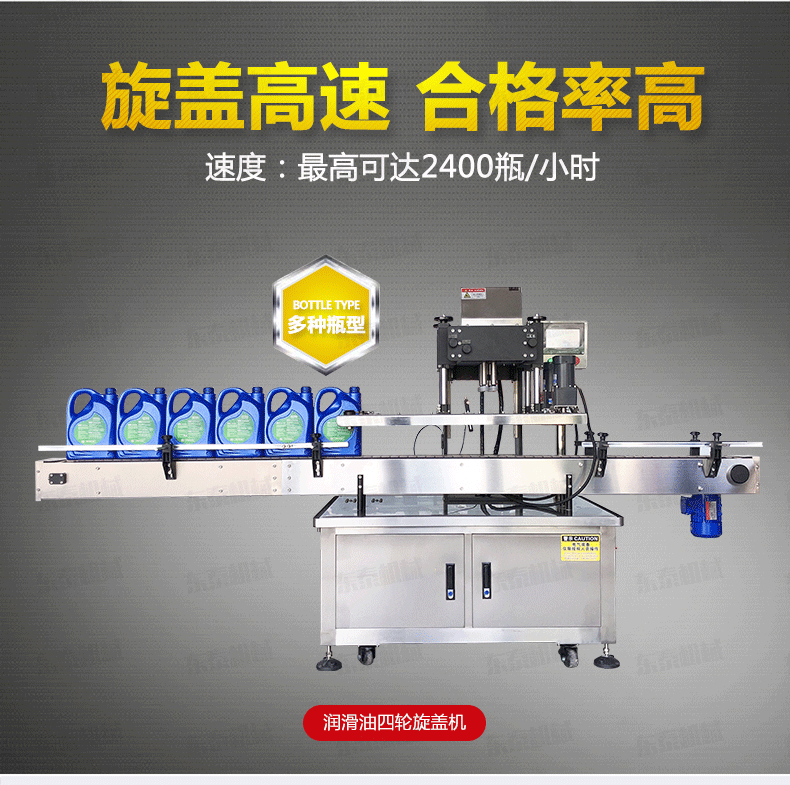 自動旋蓋機原理:電氣控制運動,穩定性強;設有定位裝置,旋蓋標準,操作方便;鎖蓋范圍寬,可鎖不同形狀規格的瓶蓋;解決了噴頭、泵頭、噴霧泵、手扣式噴頭旋蓋難的問題;鎖蓋轉速可調,可根據不同瓶蓋調節松緊度。