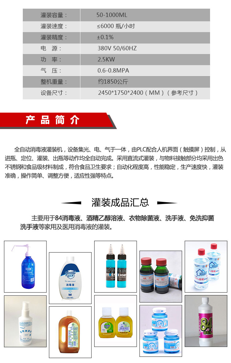 應用領域:適用于食品飲料、醫(yī)藥、化工、農藥等行業(yè)中各種流動液體的灌裝。如果消毒液、酒精、殺菌劑、溶液等。